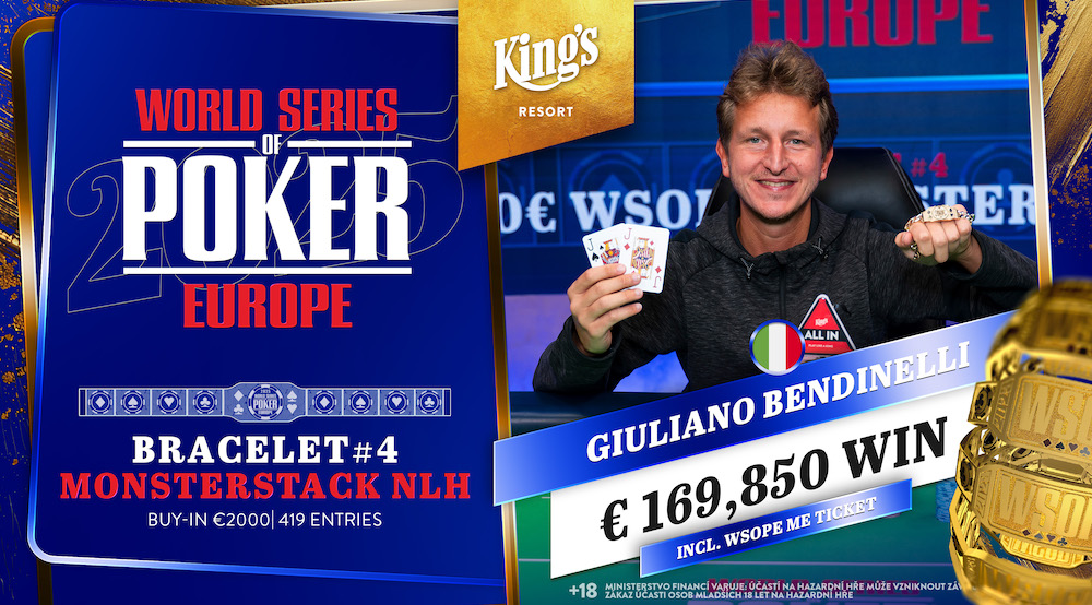 Con il successo nell’Event #4 2000 € Wsop Europe Monsterstack No Limit Hold’em, Giuliano Bendinelli vince il braccialetto e 159mila euro nel torneo del King’s di Rozvadov.