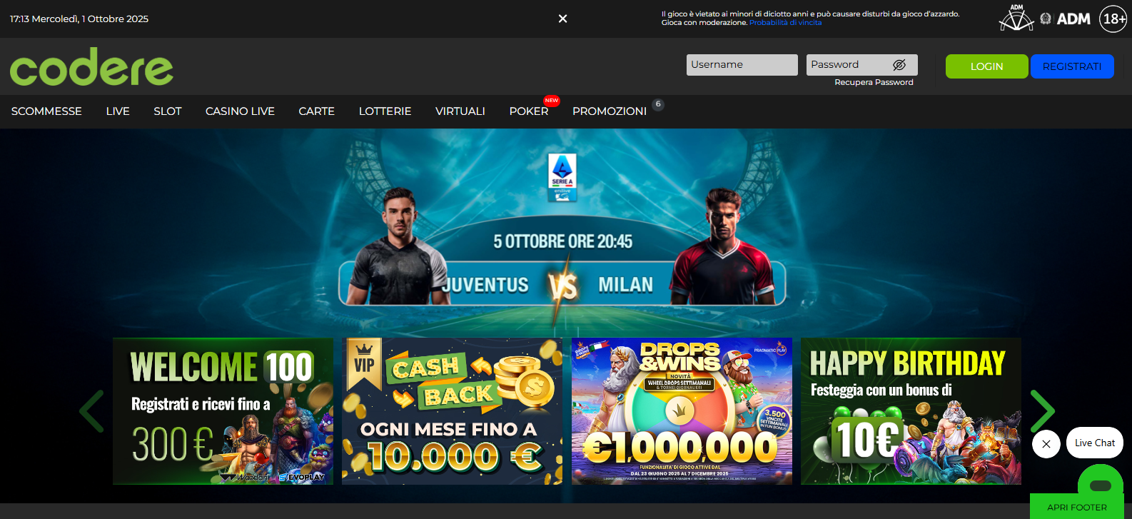 Codere Italia, appartenente a Codere S.A., gruppo internazionale di riferimento nel settore del gioco legale e responsabile, col suo ingresso nell’ambito del gioco online, segna un ulteriore passo strategico nell’evoluzione della propria offerta nel mercato italiano, offrendo agli utenti un ambiente di gioco sicuro, regolamentato e tecnologicamente avanzato. Il sito codere.it propone un’ampia gamma di prodotti sempre nel pieno rispetto delle normative Adm (Agenzia delle Dogane e dei Monopoli).