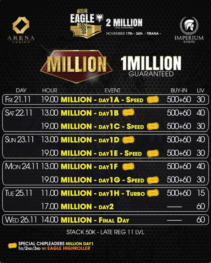 Altri 2 milioni garantiti in palio all’Arena Casino di Tirana con Imperium Events che organizza l’Eagle, due eventi da 1 milione ciascuno dal 17 al 26 novembre.