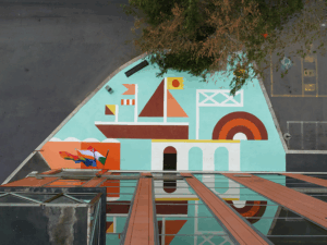 Geometric Bang firma un murale di 240 mq lungo via del Porto Fluviale, “Volti del quartiere”. L’intervento artistico si articola in una sequenza di riquadri narrativi che alternano ritratti stilizzati, elementi architettonici e composizioni geometriche astratte. L‘opera intende valorizzare la memoria storica e produttiva del quartiere Ostiense, restituendo visibilità a figure emblematiche del suo passato industriale: lavoratrici della Saccheria Sonnino, operaie del Lavatoio Lanario e dei mercati generali. I soggetti, rappresentati con uno stile essenziale e immediato, assumono il ruolo di testimoni simbolici di una memoria collettiva operaia, con particolare attenzione al contributo femminile nello sviluppo economico e sociale del territorio.