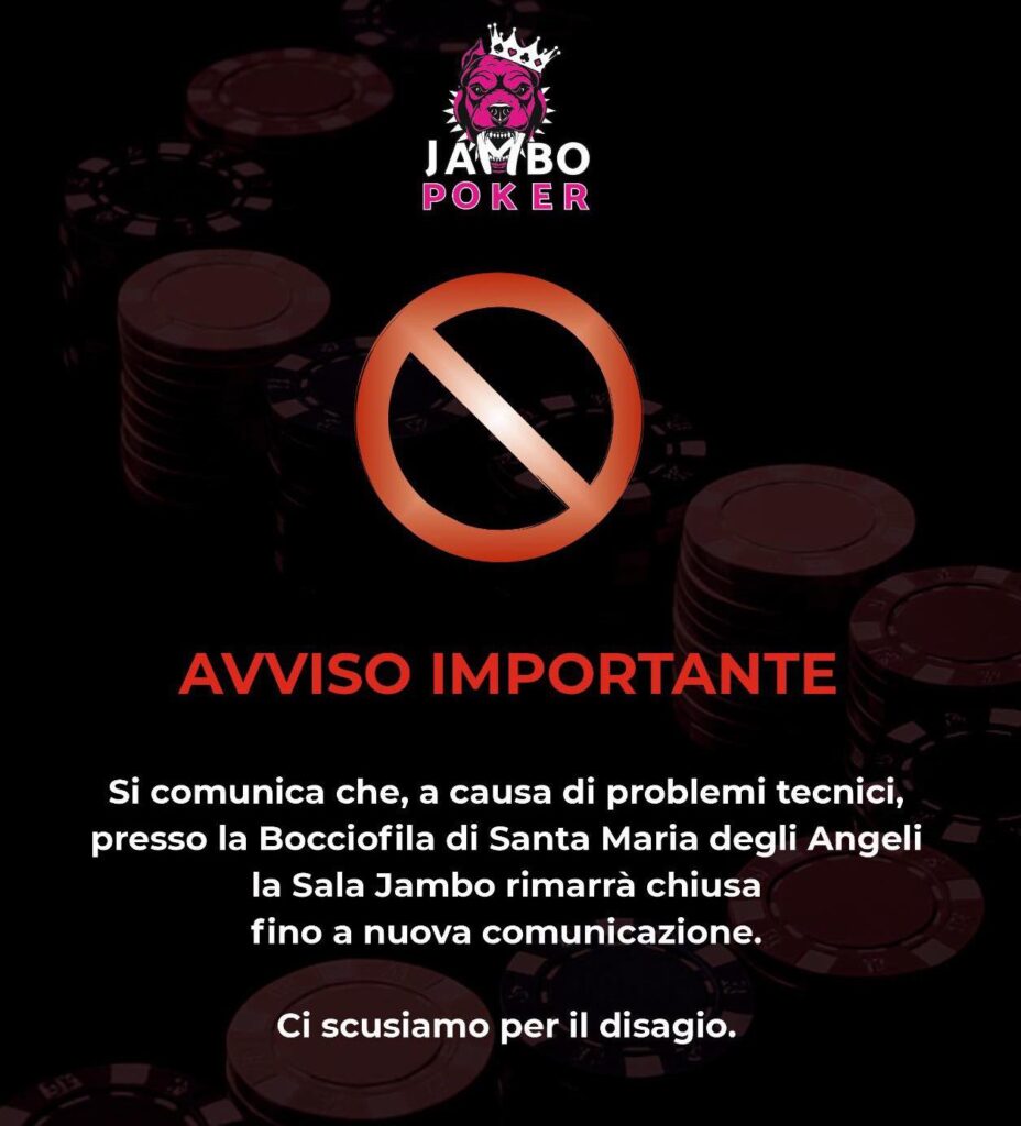 “Si comunica che, a causa di problemi tecnici, presso la bocciofila di Santa Maria degli Angeli la sala Jambo rimarrà chiusa fino a nuova comunicazione. Ci scusiamo per il disagio”. Nella provincia di Perugia torna l’incubo di sequestri e denunce di poker live. Nella serata di ieri, lunedì 12 gennaio, è toccato alla Jambo Poker che, come si legge nel breve comunicato diffuso sui social, rimarrà chiusa proprio per il blitz delle forze dell’ordine.