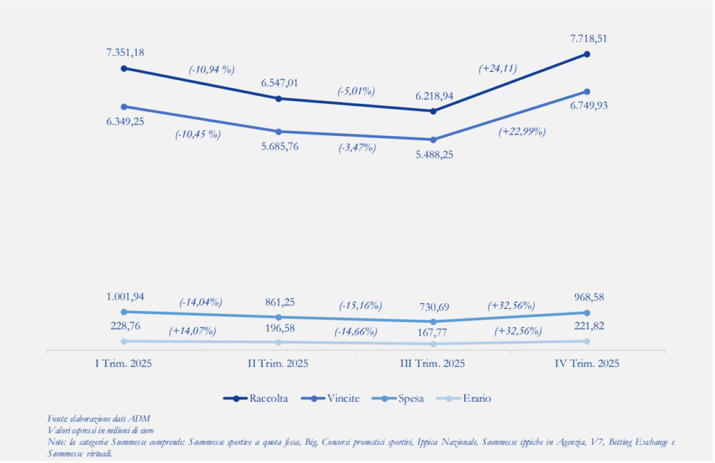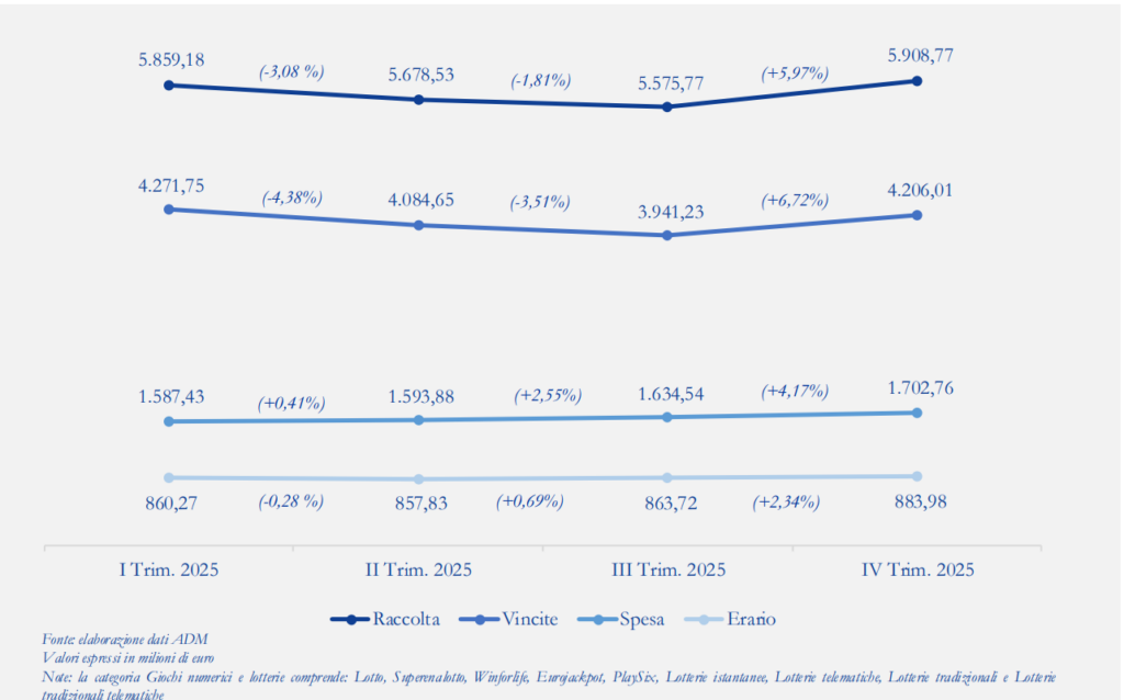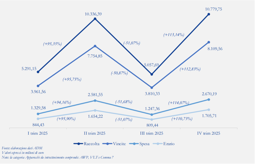 Fine anno da circa €3,4 miliardi con un boom di crescita del 43,48% rispetto al trimestre precedente e dell’11,33% rispetto allo stesso periodo del 2024. Il cumulato annuale parla alla fine di €11.471.510.000, sostanzialmente in pari rispetto al 2024 con un calo di appena lo 0,74%.
