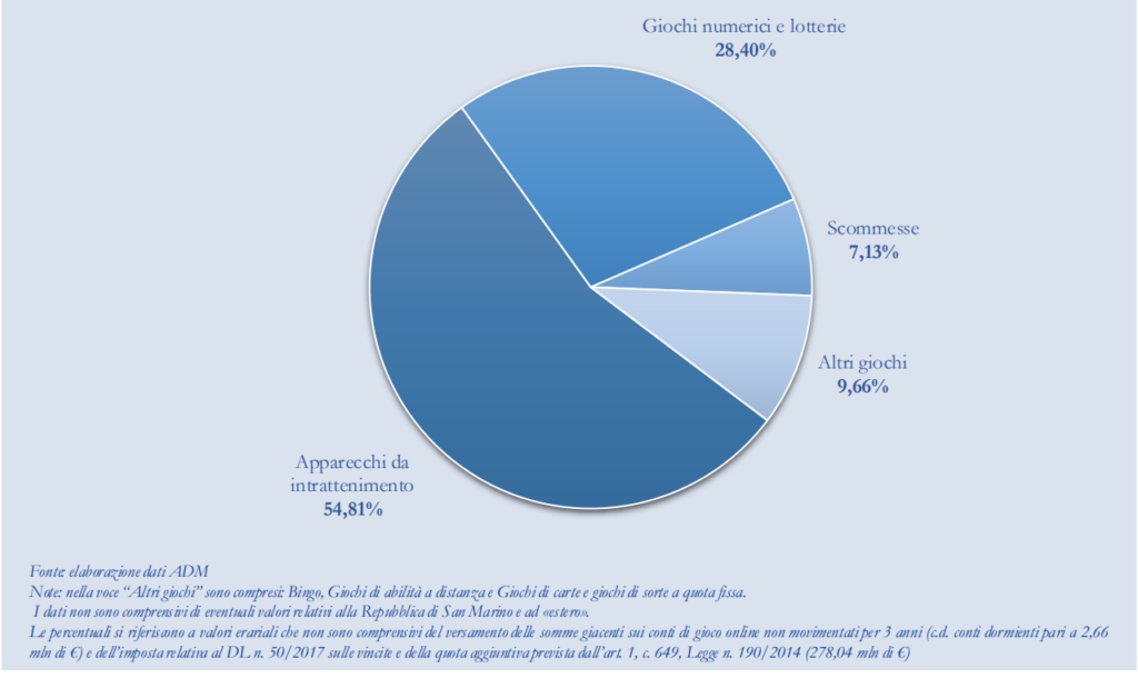 Gli apparecchi da intrattenimento sono sempre metà mercato mentre le lotterie si attestano quasi ad un terzo. Le scommesse emergono al 7,13% e gli altri giochi al 9,66%.